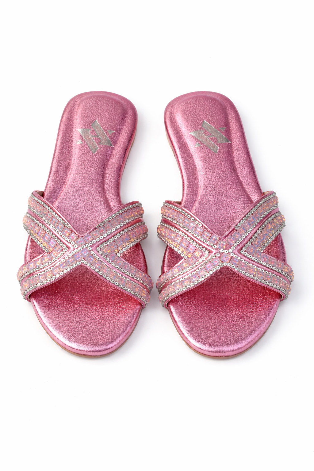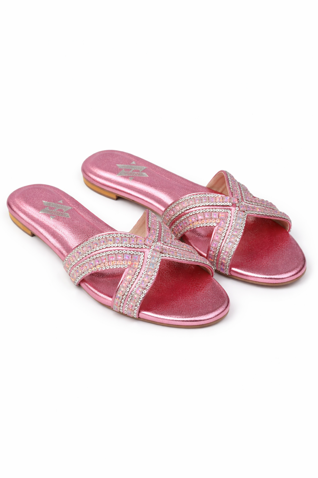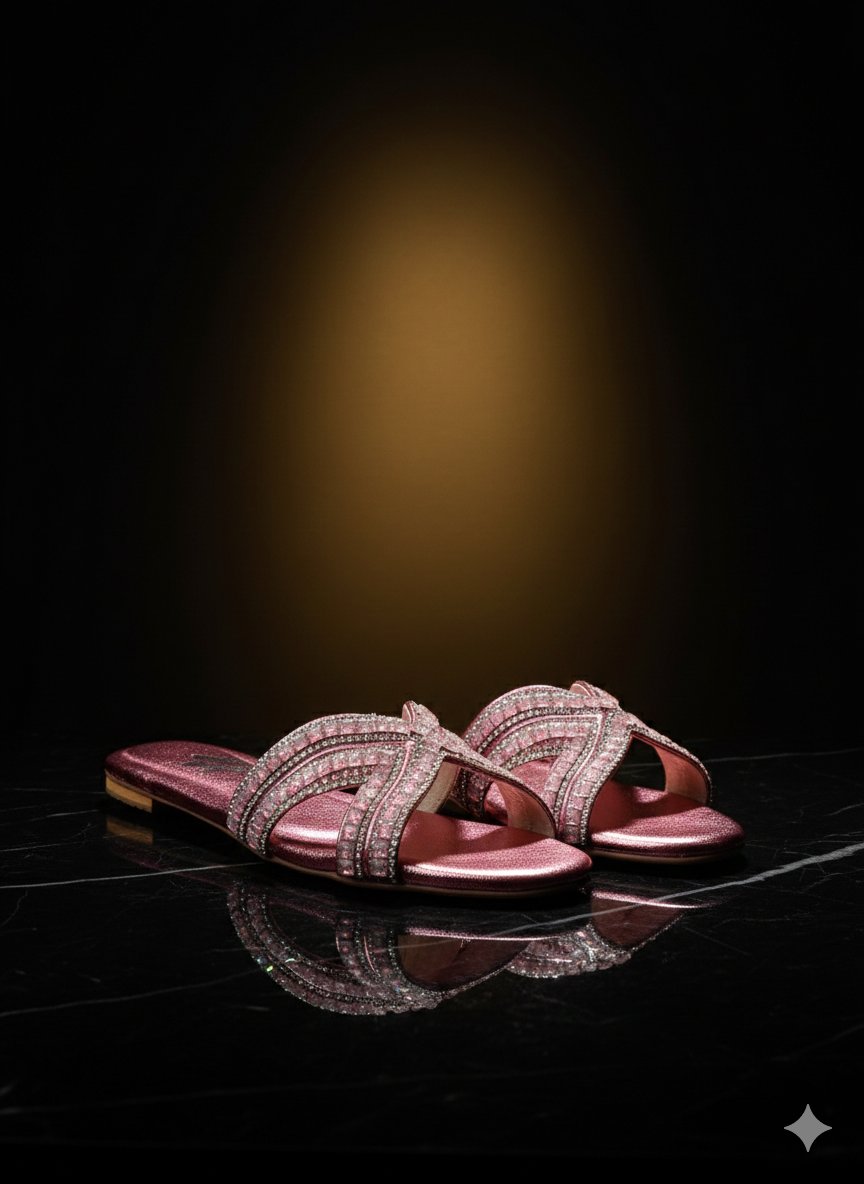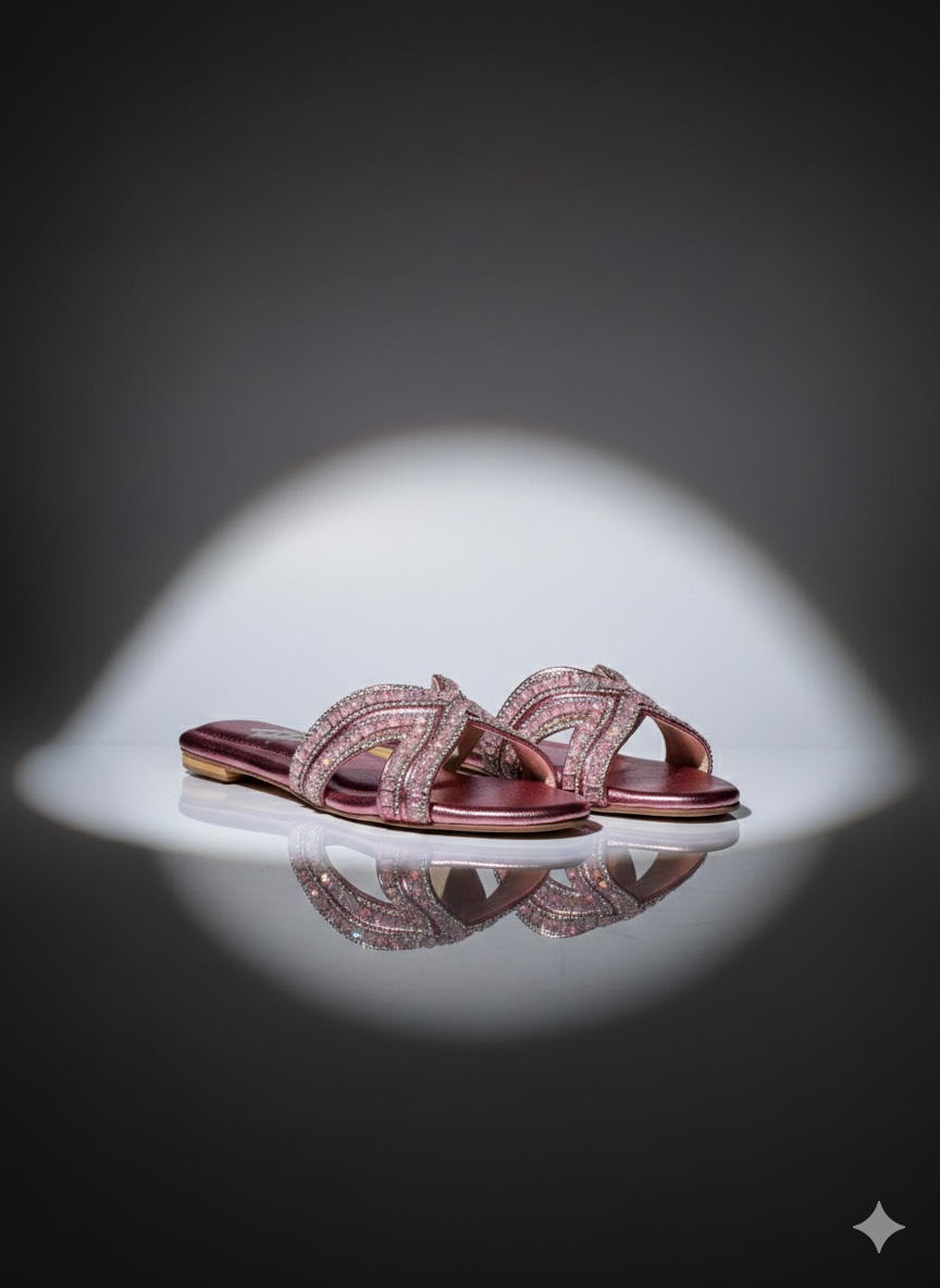 The Lyra slider is a masterclass in soft glamour, blending a romantic color palette with intricate architectural detailing. Set against a shimmering rose-quartz metallic base, these sandals feature a dynamic cross-strap design that elegantly hugs the foot while providing a canvas for high-shine embellishment.
