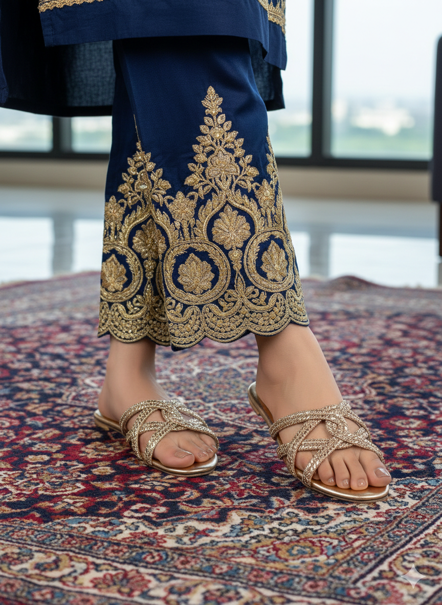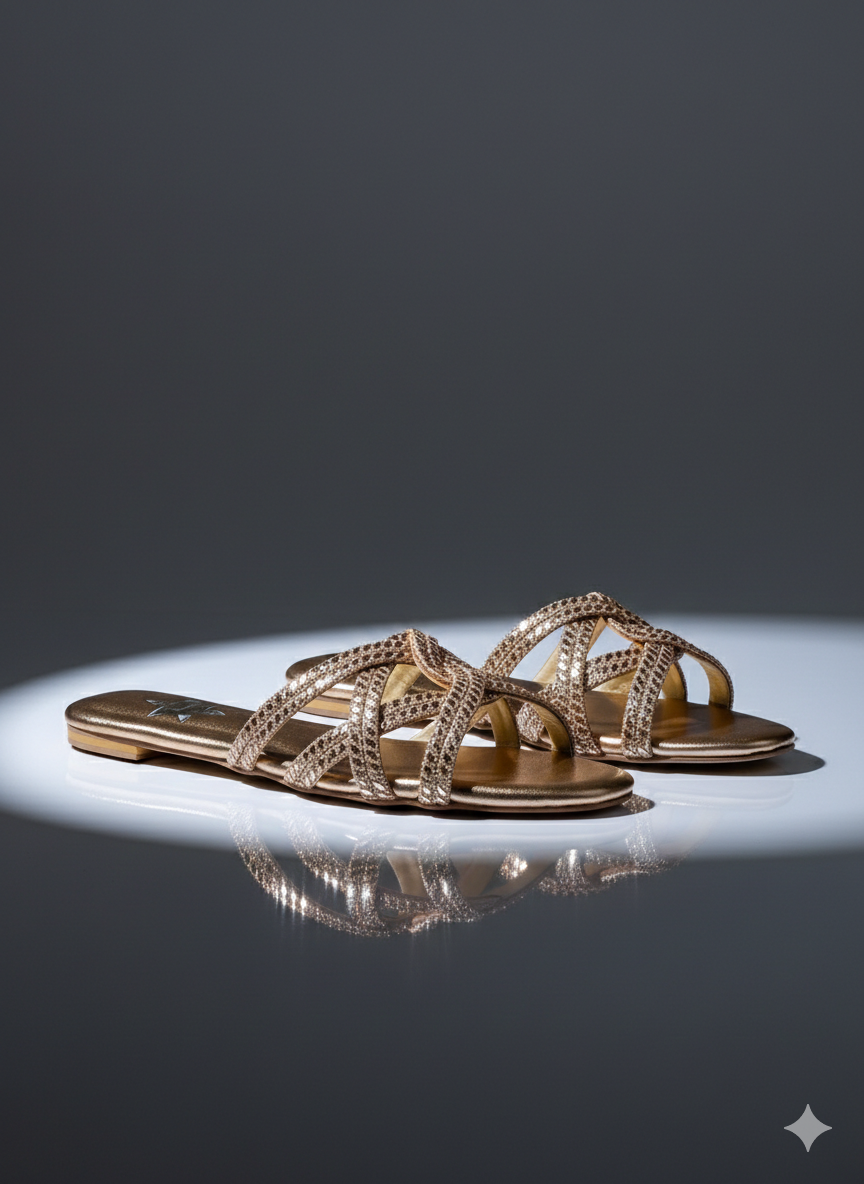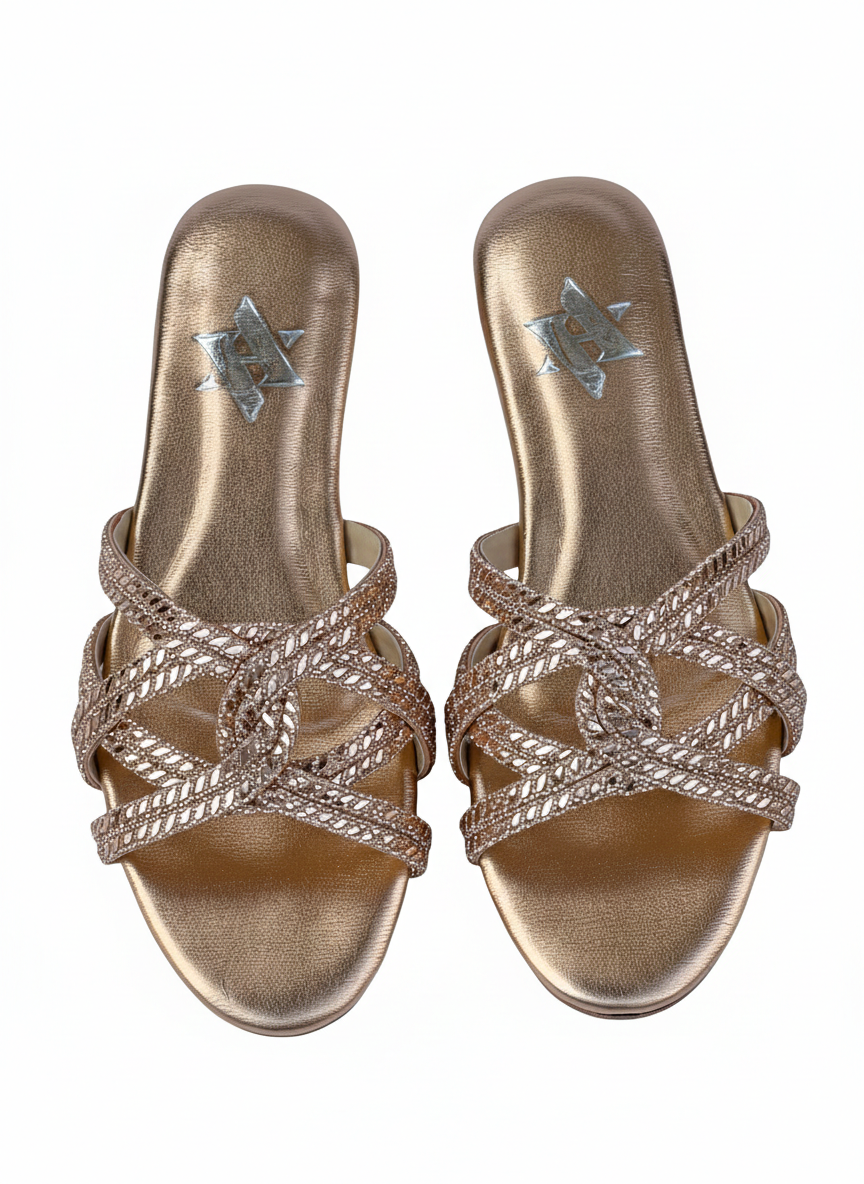 Step into the spotlight with these radiant metallic slides, meticulously crafted with crisscross straps and pavé-set crystals that capture the light with every move.